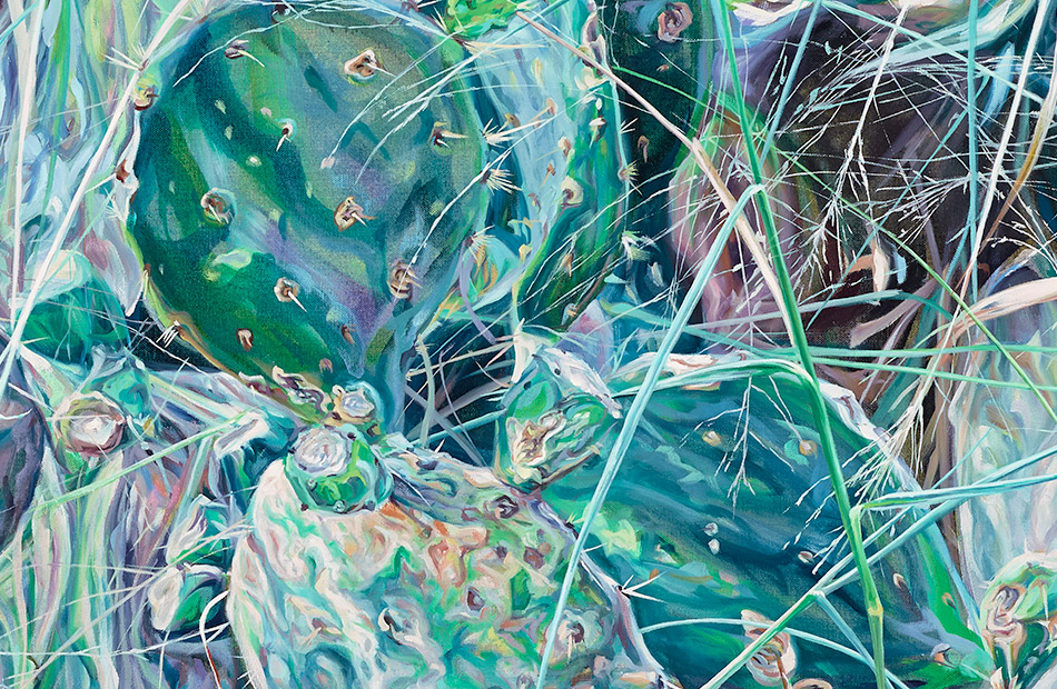 I often paint cactus. I feel the history and identity of my home in the colors and shapes of this humble plant. Old Nopals are compelling sculptures that hold life and decay as the bottom pads shimmer with deterioration in pinks and purples, providing the foundation for the fresh new growth above. Their spines demand respect. The sumptuous undulations catch the light in purples and greens, and the stark white contrasting blotches hide the cochineal insect, an ancient and potent source of red dye coveted by Indigenous cultures and conquering Europeans.